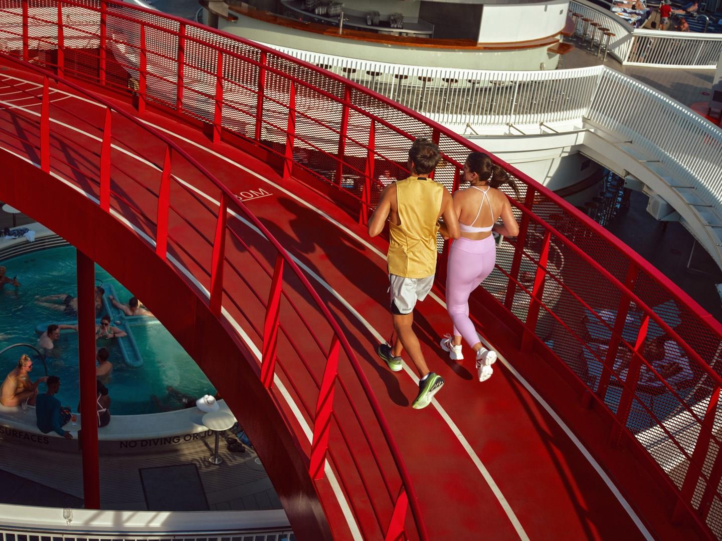Our signature, Virgin-red running track forms a (255 meters-ish) halo-like vision over the ship, allowing you to sweat, strut or stroll. Because for some of us, the only kind of running we do is... from our problems. And don't forget the SPF — The Runway is outside and the sun, unlike our problems, will catch up with you no matter how fast you run.
